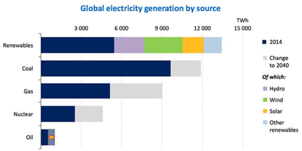 Zpráva předpovídá, že globální investice do čisté energie dosáhnou 7,4 biliónu do roku 2040. Obnovitelné zdroje bude poskytovat asi čtvrtinu světové elektrické energie a vítr bude asi hlavní zdroj.