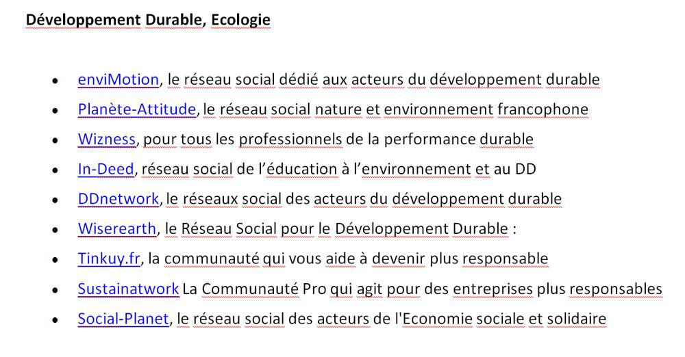 V přehledu uvádíme základní přehled hlavních skupin, které pracují v oblasti trvale udržitelného rozvoje a ekologie, včetně profesionálního podnikového poradenství. Na prvním místě zájmu stojí v poslední době otázka sociální a ekonomické nerovnosti. Nůžky mezi bohatými a chudými se rozvírají všude, i ve Francii. Klikněte si na specializovaný web na věnovaný přímé sociální pomoci formou věcných darů pro potřebné. Jiné skupiny soustřeďují do pracovních skupin aktivisty různého zaměření, profesí a politické či náboženské příslušnosti. U nás je podobný typ komunitní práce zatím málo praktikovaný, a to i v občansky a politicky spřátelených skupinách. Dalším klikem se dostanete na komunitní mediální web Agoravox, kterým stylem práce (ale ne ideovým zaměřením) odpovídá naší e-republice.