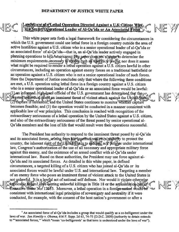 Útoky drony už zabily minimálně dva Američany v Jemenu, kteří zde dlouhodobě bojovali na straně al-Kájdy. Problém je v tom, že ani jeden z nich nebyl oficiálně obviněn v USA ze žádného zločinu. Čili šlo o akt státního terorismu proti vlastním občanům. Novináře a nezávislá média ovšem šokovala formulace, kterou toto memorandum používá. Zabití osob bez soudu je možné v případě, kdy hrozí hrozba teroru v blízké budoucnosti. Nikde ovšem není vysvětleno, co myslí pod slovem "iminentní hrozba" nebo časovým určením "blízká budoucnost".