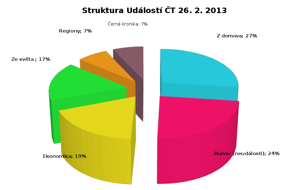 Pokusili jsme se sestavit obsah této zpravodajské relace do podrobné tabulky. Zde je zdroj ke stažení Udalosti-CT-26-02-2013.ods. Pro přehlednost jsme jednotlivé příspěvky rozdělili do jednotlivých oblastí. V Událostech neexistují rubriky. Příspěvky jdou za sebou zdánlivě chaoticky, nikdo není schopen dopředu určit z jakého bloku bude následující zpráva. Řazení sice má svoji logiku, ale nikoli zpravodajskou. K tomu v další části.
