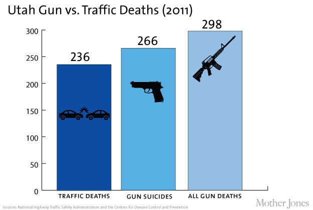 Americké weby zveřejnily zajímavou statistiku z amerického státu Utah (11.3.). Poprvé zde bylo zabito zbraněmi více lidí než zemřelo při dopravních nehodách. Tabulka ukazuje nehody, sebevraždy zbraněmi a pak celkový počet zastřelených osob.