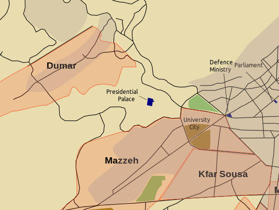 V Damašku povstalci ovládají úzké uličky čtvrti ve starém městě, kam nemohou tanky a těžká technika. Proto povstalci odtud nemohou a nemají na boje v širokých ulicích obklopujících prezidentský palác. Další bitva mezi povstalci a vládními jednotkami se odehrává v jižní části Damašku, kde prozatím vládne patová situace: nepostupují ani rebelové ani vládní vojska. Klíčové území ovládané Palestinci vyhnanými Izraelem, kteří žijí v uprchlickém táboře Jarmuk asi přešlo na stranu Asada, viz tento článek. O jižní část města se tvrdě bojuje, viz článek o dobývání Dabáji a zastřelení syrské novinářky jménem Yara Abbas (zde).