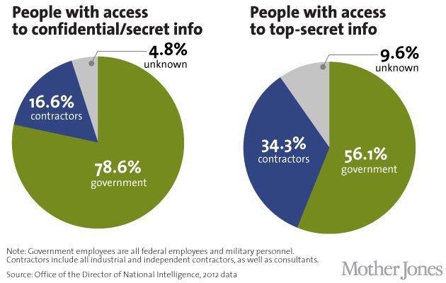 Aktivistický web Mother Jones ukázal, proč jsou kritické reakce EU na špionážní boom v USA naprosto oprávněné. Viz článek Skandál kolem odposlechů v USA znepokojuje EU. Stále více kontraktů totiž dostávají soukromé firmy. Whistleblower Edward Snowden ze soukromé firmy ukázal rozsah fízlování a novináři začali zkoumat, kdo tuto špinavou práci pro stát vlastně dělá. A zjistili znepokojující věc. Jeho mateřská firma Booz Allen Hamilton zaměstnává 12,000 zaměstnanců s tajným posláním a celkově pro soukromé firmy pracuje na tajných úkolech 483,263 lidí. Na prvním grafu vidíte nárůst privátního sektoru na fízlovacích vládních programech v posledním desetiletí.