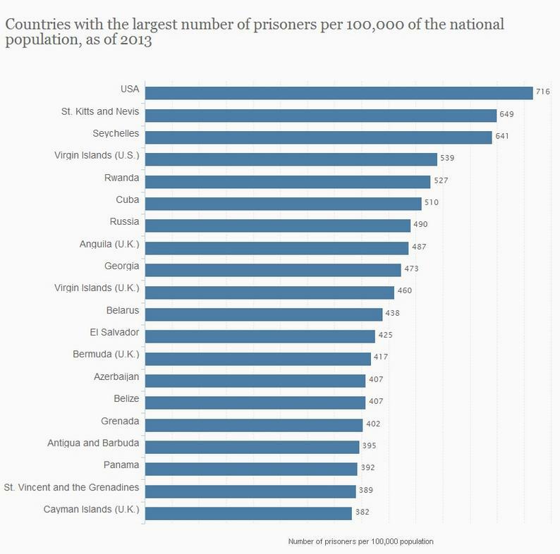 Pohled do zákulisí vězeňství v USA ukáže stejné paradoxy a ekonomicky založenou krutost, jakou jsme popsali ve studii o vlastnění zbraní a masakrech šílenými střelci. Viz tematické číslo Zbraně v USA (2013-03). Podívejte se na tento mezinárodní graf, který ukazuje počet vězňů na 100tis. obyvatel dané země. USA jsou zdaleka na prvním místě (716) a daleko za Ruskem (490).