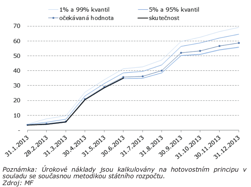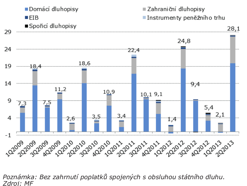 Skutečné čisté úrokové náklady státního dluhu v prvním pololetí dosahují 30,2 mld. Kč, což je o 4,0 mld. Kč více než za stejné období roku 2012.