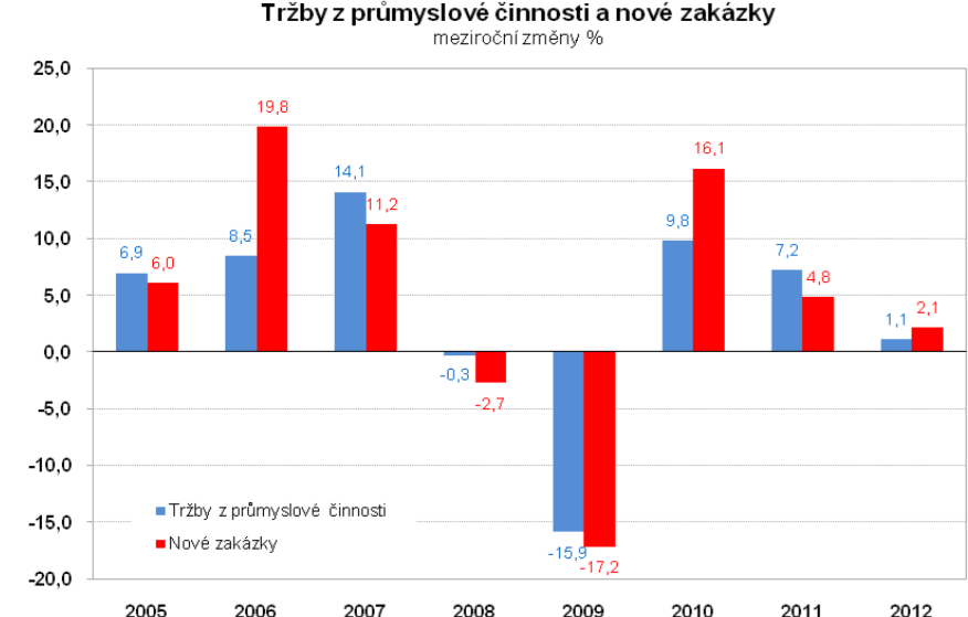 Nové průmyslové zakázky byly v roce 2012 o 2,1 % vyšší než v předchozím roce. Tento růst byl mnohem menší než v roce 2011, kdy zakázky meziročně vzrostly o 4,8 %. Vývoj nových zakázek táhnou nahoru především objednávky ze zahraničí, které