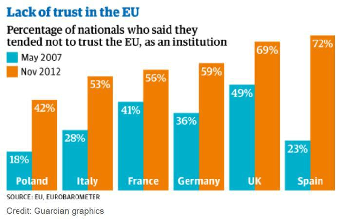 Podobnou krizi věrohodnosti nyní prožívají úředníci v Bruselu. Belgický deník La Libre citoval předsedu Evropské rady. Herman Van Rompuy prohlásil, že volby do EU v roce 2014 budou velmi obtížné, díky vlně tzv. "populismu" odmítajícího Evropskou unii. Podívejte se na poslední měření míry důvěry v šesti největších státech EU.