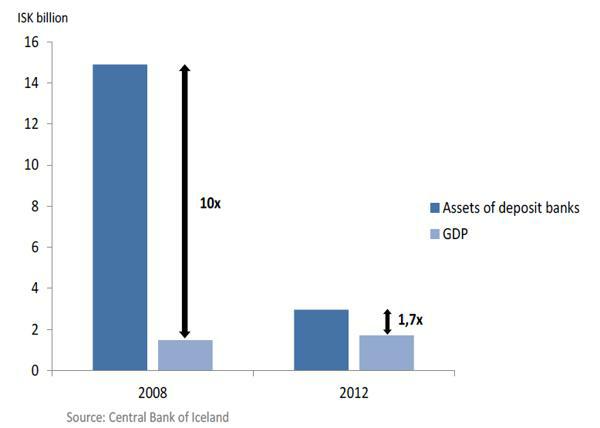 Nemá smysl malovat celou situaci v zemi narůžovo, protože je pořád vážná. Ale grafy ukazují podstatné změny. Vyjděme z oficiálních dat z června 2013 (The Icelandic Economic Situation Status Report - July 2013). První graf je klíčový a ukazuje, jak se stát zbavil bankovního šrotu a z něj vyplývajících závazků. Toto by nebylo možné bez vůle lidu a bez kriminálního odsouzení politiků a bankéřů.