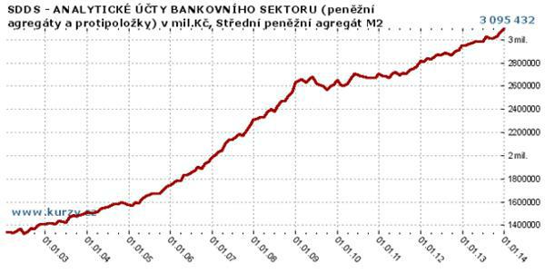 Zadlužujeme se příliš rychle. Státní dluh k 31. 12. 2013 dosáhl 1751 tis. miliard korun a očekávaná skutečnost v roce 2014 by se dle Eurostatu měla pohybovat kolem 50 % k HDP. Co se týká HDP, nedostali jsme se ještě ani na úroveň roku 2008. Přestože ekonomika stojí, objem měnového agregátu M2 (tedy peněz emitovaných ČNB M1 + quasi peníze obchodních bank M2), strmě stoupá. Viz graf níže.