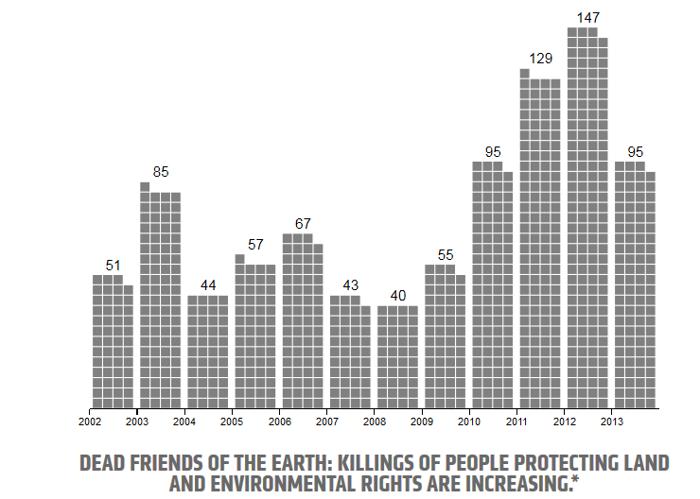 Celou publikaci si můžete stáhnout zde v PDF. Klíčová tabulka s počty zabitých environmentálních aktivistů v jednotlivých zemích světa od roku 2002-2013 je na straně 10.