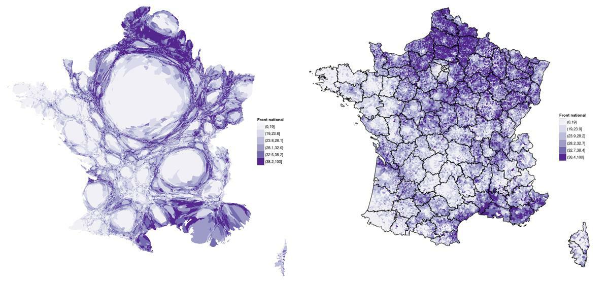 Bílá místa ukazují bohaté regiony, kde voliči mají jiné možnosti, a to jak v životě, tak i v politice. V prosperujících regionech kolem velkých aglomerací severu a částečně i jihu nemá FN velké zakotvení. Ale Francie zbídačelých regionů vytváří úplně jinou mapu. Oblasti sociální prekarity se pořád zvětšují a obkličují bohaté regiony. To ukazuje první mapa v přehledu 20 let. Tam občané volili s převahou FN jako jediného kandidáta na možnou změnu, viz druhá mapa EU-voleb v roce 2014. Chudí lidé vidí integraci EU-bankéřů a multinacionál právem jako své životní nebezpečí. Mimochodem, v tom si Le Penová velmi dobře rozumí s prezidentem Putinem.