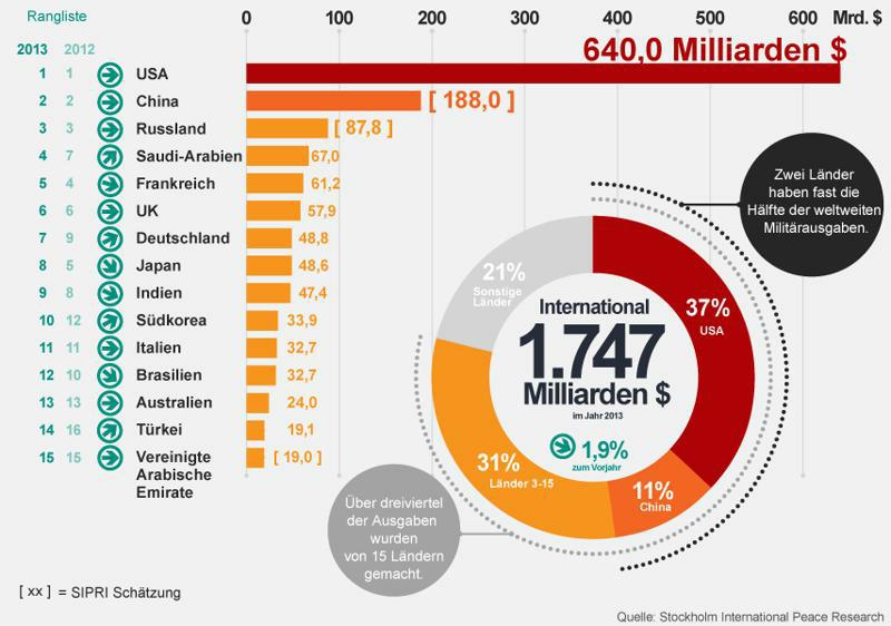 Co vše si lze představovat pod pojmem „klíčové zájmy“ USA? Přístupy k trhům, k surovinovým zdrojům celého světa, k levné pracovní síle a k zajištění zisků pro americké koncerny a banky. Tímto směrem jde i ovládnutí „spřátelené EU“ v podobě TTIP nebo ovládnutí Evropské centrální banky a ostatních centrálních bank těmi správnými lidmi. Z hlediska historické ekonomie platí, že proslov Baracka Obamy, který ještě nestačil vrátit Nobelovu cenu míru, by podepsal každý imperiální politik 19. století. Podíváme-li se na výdaje na zbrojení v roce 2013 v souvislosti s dnešními "válkami čtvrtého typu", pak člověku běhá mráz po zádech. Kdo má zájem na válce? Podívejte se na výdaje na zbrojení v roce 2013, zdroj Stockholm International Peace Research.