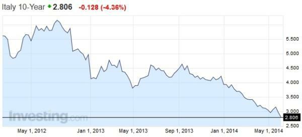 Rada ECB dělá z lidí zbytečně pitomce. Jde o přerozdělování - peníze se stěhují do dluhopisů zemí jižní eurozóny - a o další nafukování akciové bubliny. Draghi je skutečný vlastenec a opravdu pomohl svým přátelům na jihu. Peníze investorů se v pátek jako vlna převalily do státních dluhopisů, výnosy ze státních dluhopisů klesly v pátek na rekordních 2,837 % u 10ti letých dluhopisů, u španělských dokonce na 2,50 %. To je nejnižší stav od doby zavedení eura, viz graf.