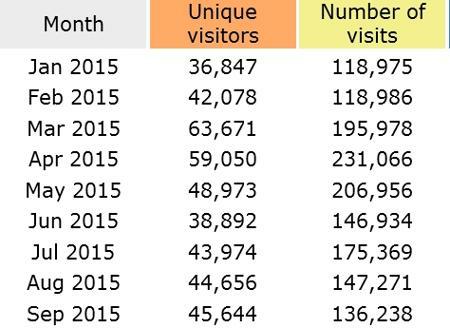 Reagovali jsme na kritiku, že web je pomalý, špatně se v něm orientuje, nesnadno se z něj přebírají články, protože jsou psané ve wiki-kódu, a nikoliv v klasickém kódu html. Web běží o něco rychleji, protože jsme provedli údržbu a optimalizaci databází, koupili jsme vyšší verzi serveru. Průměrná návštěvnost za poslední 3 měsíce (srpen až říjen 2015) je kolem 4,5 tis. kliků („number of visits“) denně. Statistika individuálních přístupů za rok 2015 vypadá takto.