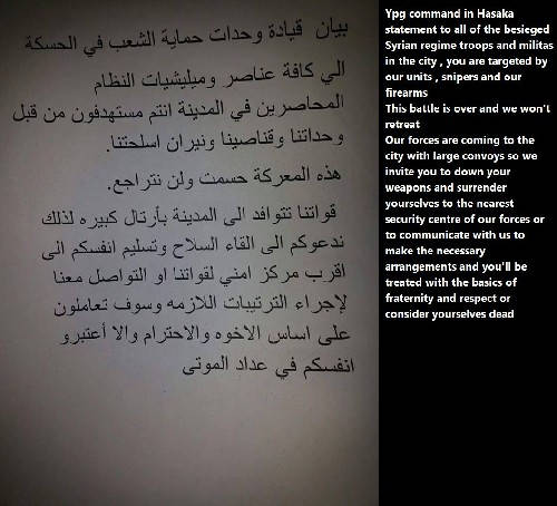 Po jednání o příměří dohodnuté Rusy v Kámišli zdejší Kurdové pod vedením skupiny PYD a Asajíš dali Asadovcům v Hasace jednoduše ultimátum. Jejich prapory se rozpustí a odevzdají zbraně a totéž platí pro jejich spojenecké milice. Jinak všichni zemřou v boji. Po odevzdání zbraní se na ně bude pohlížet jako na bratry, a třeba je ani nikdo nezastřelí. A těchto milicí napojených na SAA není v Hasace až tak málo, protože válečně a etnicky rozjetým Kurdům zde už velká část minorit přestala věřit. Není to totiž první útok a první vysídlovací akce Kurdů spojená s etnickou čistkou. Hizballáh už musel jít bránit šíitské vesnice ohrožované Kurdy, proto mají asyrští křesťané a jiné skupiny své vlastní milice, které bojují buď s tím nebo s oním spojencem.