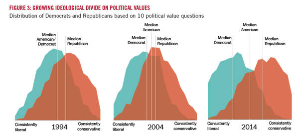 Graf ukazuje názorové rozdělení na 10 vybraných ideologických otázek. Modří jsou demokraté, oranžoví Republikáni. Amerika je ideologicky rozbitá a polarizovaná jako nikdy předtím. A týká se to zejména střední třídy. Chudina ve městech se politizuje mnohem radikálnějším způsobem daným rasově a sociálně. Nepotrestané policejní vraždy černochů vedou k radikalizaci nespokojených a zchudlých mas uvnitř velkoměstských ghet. A když k tomu připočteme rozpadající se infrastrukturu, tak není divu, že Národní garda si kupuje klasickou vojenskou výstroj k budoucí válce ve městech. Viz náš článek Pentagon se připravuje na občanské nepokoje dané klimatickými změnami. Špionážní vojensko-policejní drony hlídkují například nad Baltimorem stejně jako nad Sýrií. US-režim se chystá na občanskou válku v ruinách ghett. Nákup levných plastikových rakví, který FEMA dělá za Obamy ve velkém, také o lecčem svědčí.