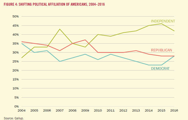 Studie je celkem rozsáhlá a každý z ní komentuje to, co se mu hodí do argumentační linie. My nebudeme postupovat jinak a začneme od konce studie, tedy politikou. K tomu viz náš článek Skutečná bitva o budoucnost Demokratické strany v USA. Z grafu jasně vyplývá, že zkorumpované partaje Republikánů a Demokratů prolezlé nepotismem, klany a politickou a ekonomickou korupcí už Američany nelákají.
