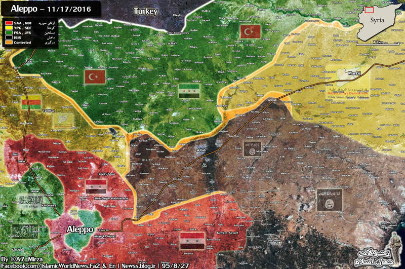 Psát o Sýrii je nyní docela těžké, protože situace na frontě se mění dost rychle díky ofenzívám. Moc povstalců se láme na mnoha kritických úsecích fronty. Poslední článek jsem publikoval pod názvem (Příměří v Sýrii skončilo a ISIL dostal přímou leteckou podporu USA). Je tam také rozbor bitvy o Šejch Miškin, o kterém píši níže. Jen pro info dávám poslední přehled South Front z 25.11.2016.