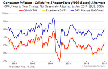 Pokud vezmeme za základ přepočtu inflace hladinu cen z 80. let, pak je to dokonce 10 %. A to je pětkrát více, než uvádí oficiální statistika. Zajímavé jsou i údaje o nezaměstnanosti. Vláda USA oficiálně udává v lednu 2017 celkem 6 % a jeho Shadow Stats dokonce 22,9 %, viz data zde.