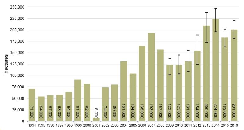 Pro vysvětlení sáhněme do ročenky UNODC za rok 2016 (World Drug Report). Statistiku do roku 2013 najdete ve výše uvedeném článku o Afghánistánu. Nová data vypadají následovně.
