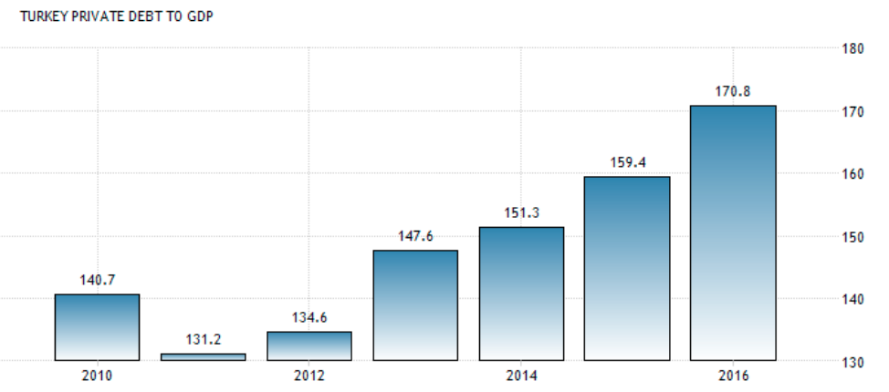 Podle grafu to znamená, že turecká ekonomika se stala tureckým hospodářstvím během jednoho týdne! Vzhledem k tomu, že jde o zemi se 70 mil. obyvatel, která funguje jako Česko a je montovnou EU, to není pravděpodobné. Podle propočtů německých ekonomů DW je reálný růst ekonomiky podobný jako v Čině, tedy 6,1 % v roce 2015, 3,4 % v roce 2016 a dokonce 7,4 % v roce 2017. Export stoupl z 85 miliard EU (2010) na 130 mld. EU v roce 2017. Takže růst v exportní podobě je silný a Česko má v postkoloniálním korporátním otroctví co dohánět. A přestože v Turecku prakticky nikdo neplatí daně a oficiálně nepracuje, tak není důvod k obavám. Za prvé a zásadně by se hodnota liry měla odvíjet od tureckého dluhu v porovnání s HDP země. Tak se na to podívejme.
