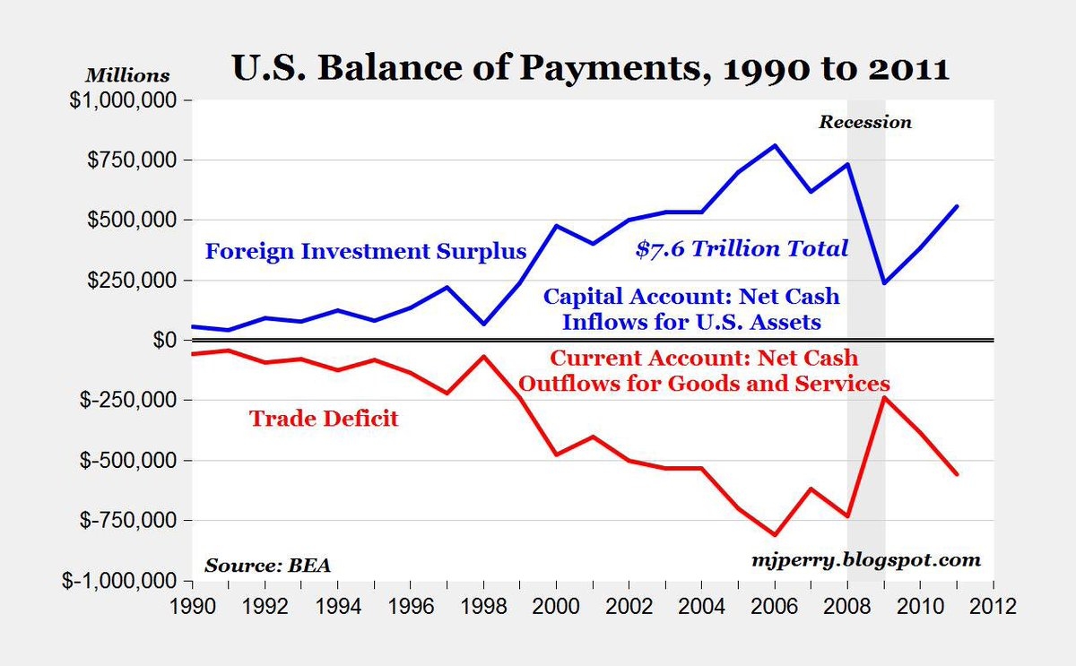 Z grafu je jasně vidět, že hlavní kšeft privátního FEDu je kšeftování se státním dluhem. Na tom nikdy neproděláte. Ale proč se ty fedové dluhopisy kupují? Podívejte se na klíčový ukazatel "Capital goods" v prvním grafu u rodiny Nováků, alias podílu export/import financí (import 641 vs. export 533). Proč se cpou peníze do země, která je v krachu a její dluhopisy nic nevynáší? A že to tak je, to ukazuje tento graf do roku 2012.
