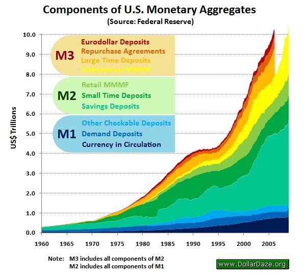 Novákovi holt potřebují to mléko a zelených papírků mají dost v bloku M2 a M3. Takže se musíme podívat, co se stane, když do banky přijede trakař dolarů z QE zadarmo. Peníze v bloku M0, M1 nemůžete navážet zadarmo trakařem, protože chudým 99 procentům peníze zadarmo do ruky nepatří. Normální lidé by hned poznali, že v mají v kešeni více a šli by utrácet. Takže sypete trakařem na čertovu větší hromadu v agregátu M2, kde lidem půjčujete, a hlavně M3. Pak to vypadá takto, viz graf za 25 let vývoje.