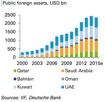 Arabové a další se chovali přesně jako jejich západní kolonizátoři. Zvýšili si standard (zelená), dělníkům nepřidali (žlutá) a zbylé peníze si uložili u bank hlavně v USA (červená). Reexport dolarů vypadal takto, viz aktiva ropných zemí uložených v zahraničí.