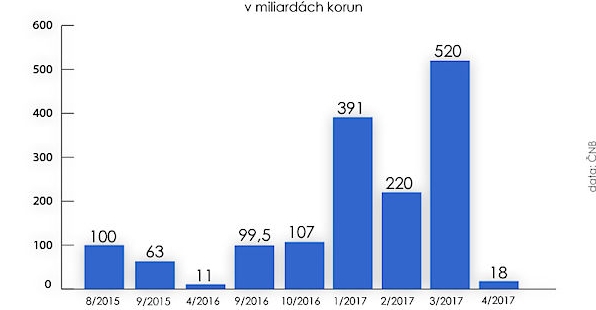 Je jasné, že Rusnok a jeho parta nemohou jít úplně jinou cestou, ale to je neomlouvá. V ČNB mají zastupovat zájmy nás, 99 procent občanů, a ne zájmy jednoho procenta a dokonce zájmy zahraničních otrokářů, pardon, investorů. A banksteři jsou v současném vedení ČNB proto, že z řady možností zvolili vědomě tu nejhorší, což se ukáže dále. Tak se podívejme, jak se dvoubilionová krádež z našich peněženek dělala v Česku. Intervence na oslabení koruny běžely od listopadu 2013 do dubna 2017, viz tento graf ČNB.