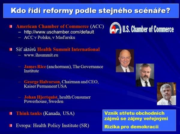S nástupem vlády Mirka Topolánka a Tomáše Julínka, Marka Šnajdra a Pavla Hroboně na ministerstvo zdravotnictví se začal realizovat program Modrá šance pro zdravotnictví do značné míry inspirovaný americkým zdravotnictvím a vývojem na Slovensku. Nejdříve se ve vládním prohlášení objevil záměr o přeměně fakultních nemocnic na akciové společnosti a záměr na v přeměnu zdravotních pojišťoven na akciové společnosti. Stejně jako na Slovensku se postupně objevilo 6 nových návrhů zákonů, které měly postupně změnit systém českého všeobecného zdravotního pojištění na systém soukromého zdravotního pojištění. V zásadě se měly našim občanům nabídnout různé zdravotně pojistné plány s různou výší pojistného, ale také s různou výší spoluúčasti za ošetření, za lékařské zákroky a operace, plateb za léky, apod. Těmto záměrům mělo předcházet zavedení tzv. regulačních poplatků, aby si pacienti na přímé platby zvykli. Nebezpečí různých pojistných plánů zdravotních pojišťoven bylo v tom, že postupně by lidé ztratili poměrně neomezený nárok na ošetření, který je dnes běžný. Nemusíme mít žádnou adresnou pojistku podobnou havarijnímu pojištění, nebo pojištění domácnosti, kde bychom museli studovat několik stránek pojistných podmínek a pracně zjišťovat, za jakou výši odvodů ze mzdy na zdravotní pojištění (% srážek ze mzdy ) máme nárok na jaký zákrok nebo na jaké vyšetření, a kolik za takové vyšetření budeme muset doplatit ze své kapsy.