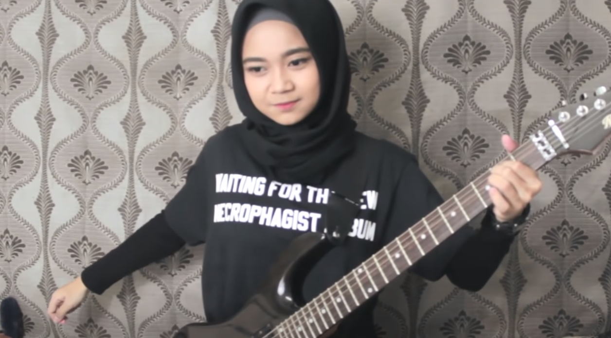 A teď pojďme na hvězdu indonéského metalu v hidžábu. Jmenuje se Meliani Siti Sumartini, narozena v roce 1997, v městě Garut, Indonésie, nyní studuje design v Bundungu. Má ještě dva sourozence. Kytaru rozlišuje na obyčejnou a na sexy kousek. Tady je první klasická metalová vypalovačka v jejím podání, kapela Slayer, song Raining blood.