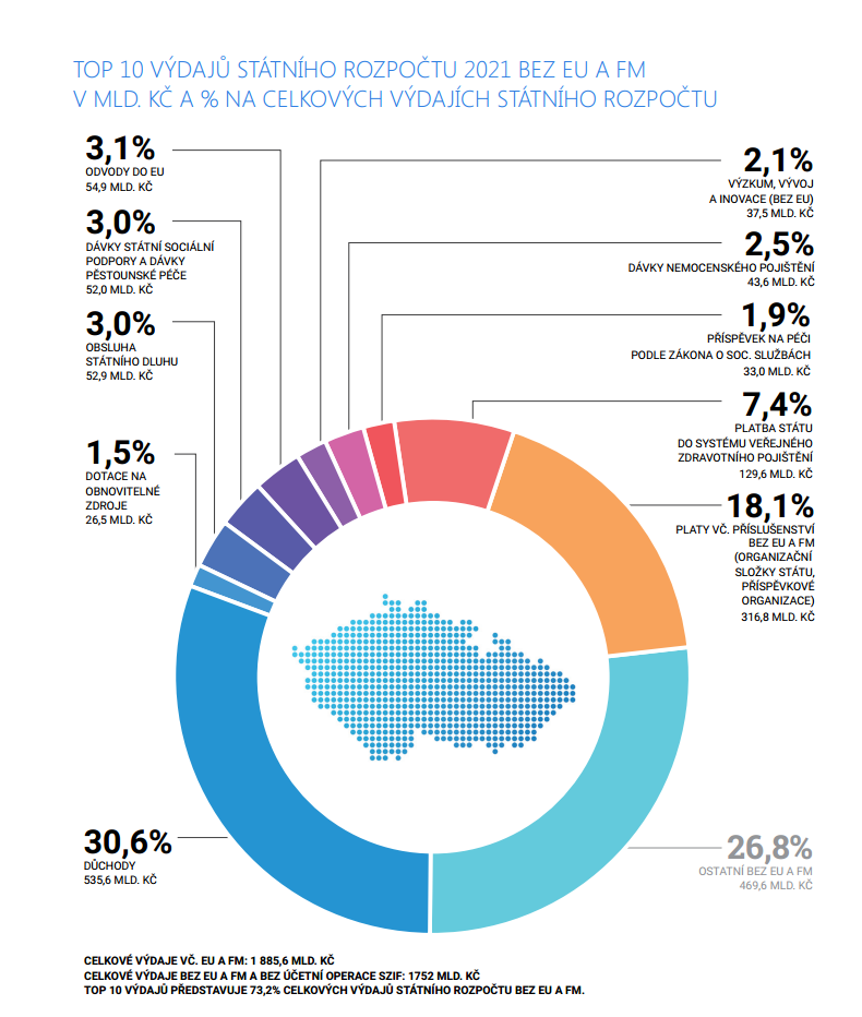Tady je hlavních 10 výdajů ze státního rozpočtu podle procent. Je to cca 80 % celkových výdajů, takže jde o dost směrodatný ukazatel. Obecně platí, že peníze jdou pořád zpět k lidem, ale ne do budoucnosti. Investice státu jsou nula a počítá se jedině školství a sami vidíte, jak. Kdyby takto budovala kapitalismus komunistická Čína, tak je tam, kde jsme dnes my.
