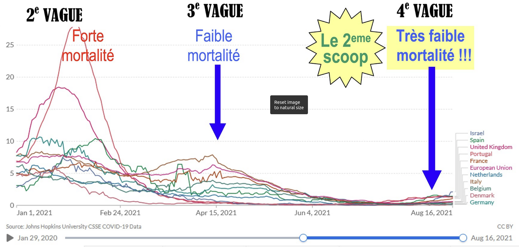 Aha, tak ti naočkovaní za půl roku přišli o imunitu a navíc začali roznášet virus, viz případ Izraele na zeleném grafu. A protože jsme jim přeprogramovali imunitní systém na alfu, tak jsou málo odolní proti nákaze delta a dalšími. A přirozenou imunitu uznávat nebudeme, ta se nedá mocensky kontrolovat. A jinou vakcínu nemáme, farmy potřebují vydělat a my musíme dále kontrolovat těch 99 procent. A jde nám to čím dál hůř, protože lidi začínají být ideologicky nakažení od těch článků a webů, jako je tento. Předtím byli jen vyplašení a nemysleli. Teď jsou sice ještě pořád vyplašení, ale pořád se dají slušně kontrolovat. Začínají však mít pochybnosti, protože se jako obvykle při válce v Afpaku a při epidemii kovidu neoliberálně lhalo a kradlo. Tak co se dá dělat, je třeba udržovat kolotoč lhaní a kontroly, viz tento graf.