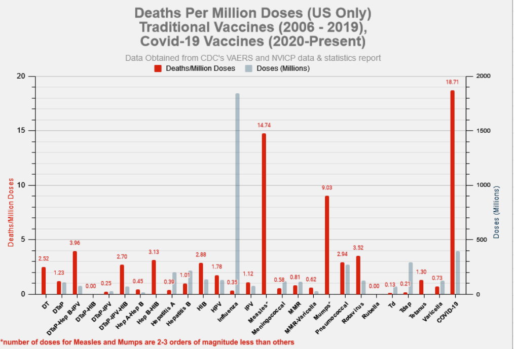 - Klíčové je porovnání celkových vakcín proti chřipce a mrtvých versus korporátní vakcíny a jejich mrtví. Nepoměr bije do očí, viz šedý sloupek normálního chřipkového očkování a stejně vysoká červená čára experimentálních vakcín. Připomeňme, že hlášení do systému VAERS je pro americké lékaře nepovinné a celkem je zachyceno jen 20-30 % vážných případů a asi 1% lehčích případů.