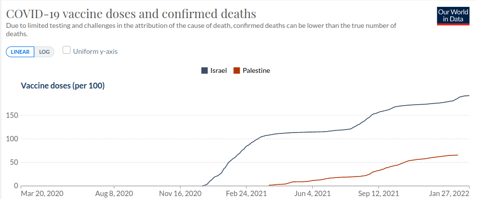 Úkolem Palestinců bylo pochopitelně umřít na kovid, proto se ně očkování jaksi nedostalo, viz tento graf.