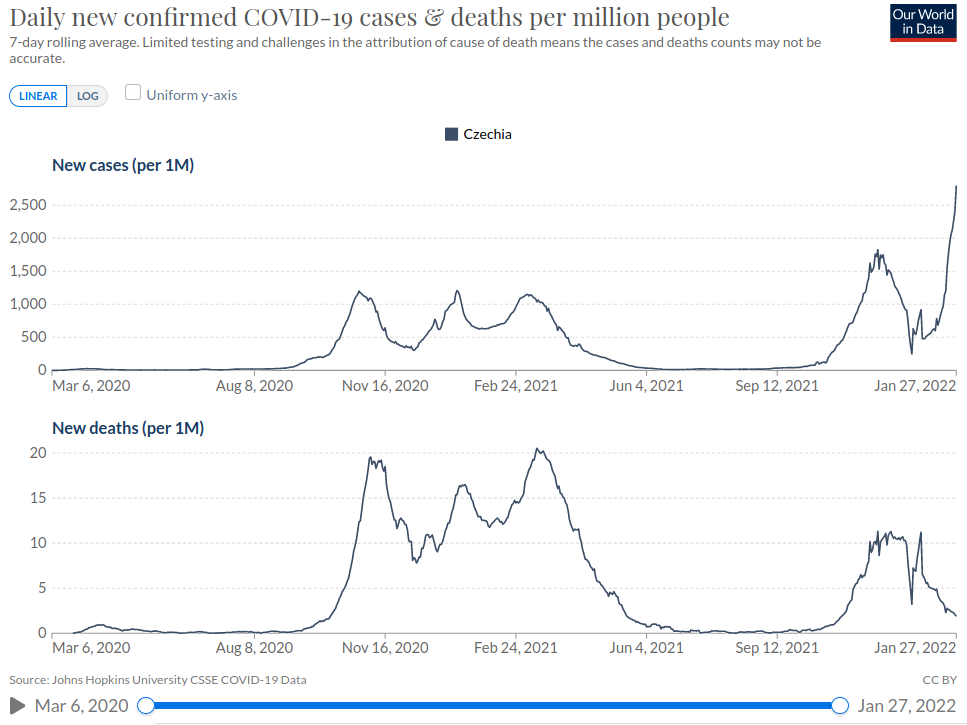 Aha, tak jsme na tom jako ti Izraelci, ale stálo nás to trochu méně miliard. Vlny kovidu chodí očkovaným Českem, jako průvan při otevřeném okně. Ale naštěstí varianty Delta a Omikron už nejsou smrtelné, viz rozdíl v obou grafech. Takže se modleme, aby umřelo co nejméně lidí na to očkování.