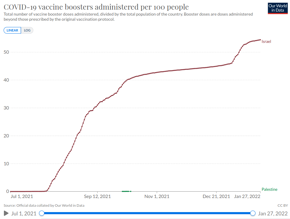 Situace na Izraelem nezákonně okupovaných územích se označuje za pomalou genocidu. Epidemie kovidu se stala další zbraní v tomto lítém boji. Izrael se pochopitelně napakoval vakcínami stejně jako americkými zbraněmi, viz tento graf pro třetí dávku této strategické chemikálie. Denně aktualizovaná data z kovidového světového trackeru najdete ZDE.