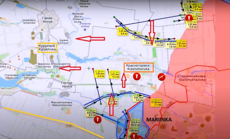 Marijinka, jižně od Krasnohorivky, bude brzy plně obsazena Rusy. Město je důležité kvůli dálnici H15, po které jsou zásobováni ukrajinští obránci. Následný útok na opevnění severně od Mariijnky povede k obklíčení Krasnohorivky (mapa 4).