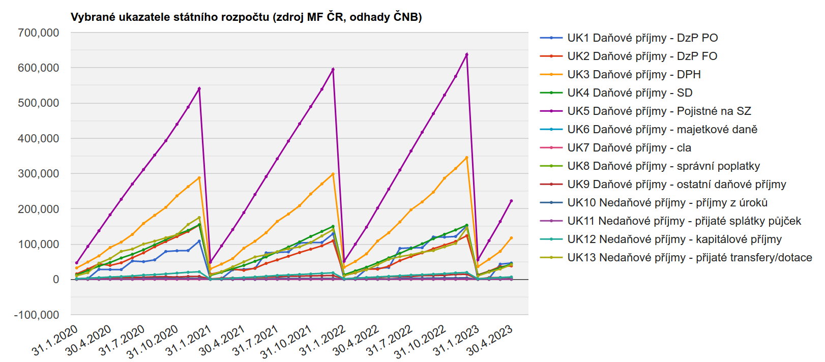 Takže soudruzi od neoliberálních strak, roku 2019 byly příjmy státního rozpočtu (tj. nejen tyto daně) ve výši 1 523,2 mld. Kč a roku 2023 jsou plánované příjmy ve výši 1 927,9 mld Kč. Schodek státního rozpočtu roku 2019 byl ve výši 28,5 mld. Kč a na rok 2023 je plánován ve výši 295 mld. Kč. Teď vůbec nemluvíme tom, že pětikolka ten naplánovaný roční dluh nasekala v jejich fiktivně udělaném státním rozpočtu (a ten si schválili jako zákon!!!) už v polovině roku, máme začátek června. Dluh musí nějak odpovídat příjmům, což se evidentně neděje. Tady máte porovnání hlavních 13 ukazatelů daňových příjmů státu z let 2020-23.