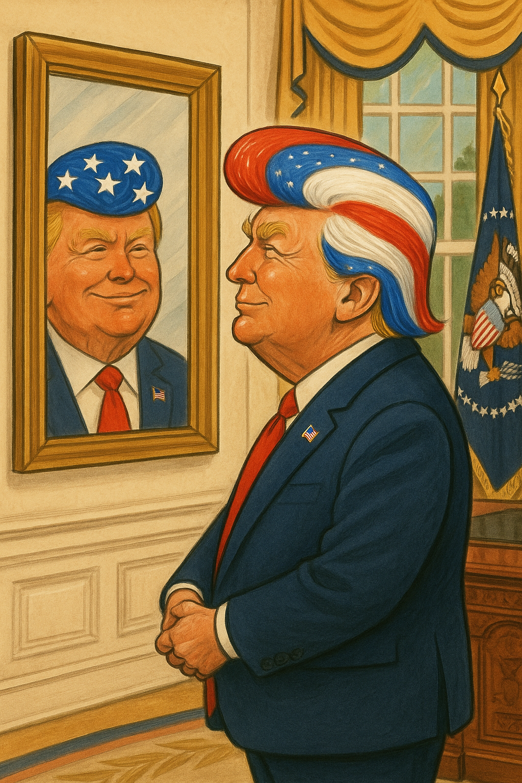 Donald J. Trump seděl v šatně Bílého domu (oficiálně zvané Mediální transfigurační zóna), a zamyšleně hleděl na prototyp své nové hlavy. Nebyla to jeho stará hlava. Tohle byla Eurovizní hlava 2.0™, koncipovaná s ohledem na maximální vizuální efekt a minimální kognitivní zátěž.