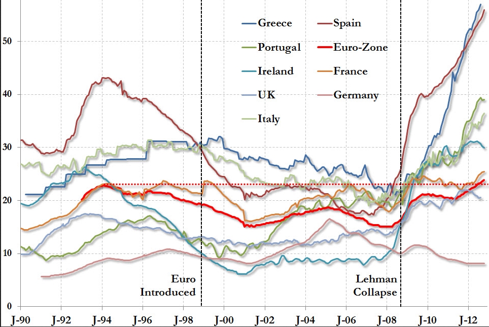 Mezitím budou ale milióny lidí připraveny o to málo, co si svou prací vybudovali. „To je zločin a dobře naplánovaný zločin“, tvrdí profesor, který vede stovku německých akademiků a sepisuje s nimi jednu ústavní stížnost za druhou. Jeho přednášku by si měla vyslechnout především německá kancléřka a její naprosto dezorientovaný ministr financí Schäuble, doporučují němečtí a švýcarští diskutéři na internetu. Podívejte se, jak růst nezaměstnanosti mladých lidí obětovaných v zemích EU na oltář eura kopíruje míru zadlužení.