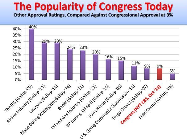 Renomovaný a spíše pravicový deník Washington Post zveřejnil průzkum popularity Kongresu, který ukazuje, že tato instituce méně populární než švábi, dopravní zácpy, včetně americkým tiskem démonizovaného Huga Chaveze, který si dovolil znárodnit venezuelskou ropu považovanou za americké vlastnictví. Kongres fakticky soutěží s Fidelem Castrem o poslední příčku. Kongres maximálně nesnáší 91 % obyvatel. Graf nejméně populárních institucí v tomto desetiletí je zde.