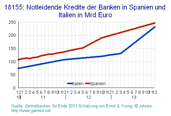 Bankovní sektor v EU je zadlužen mnohem víc než státy. Chabý podíl vlastního kapitálu bank je schopen pokrýt jenom zlomek ztrát z nedobytných úvěrů, jejichž objem neustále narůstá. Například na Kypru visí ve vzduchu každý druhý úvěr, ve Španělsku je to 17 % (250 miliard eur), v Itálii jen meziroční nárůst nesplacených úvěrů činí 22 % a celkový objem nesplacených úvěrů činí 220 miliard, jak je vidět z níže uvedeného grafu.