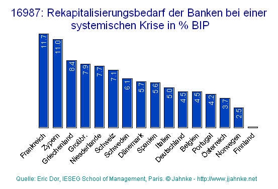 Měli bychom se ptát - pokud nejsme političtí idioti - co vlastně do nynějška dělala Evropská centrální banka? Copak neměla ve své náplni vykonávání bankovního dohledu, když byla zavedena jednotná měna euro? Následující graf ukazuje, kolik procent z HDP je potřeba již nyní na rekapitalizaci bank.