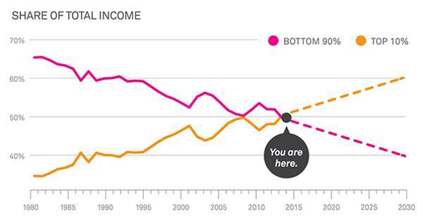 Nyní mohou zbohatlíci celé planety slavit se šampaňským historické vítězství. Okradli zbytek populace neuvěřitelným způsobem, viz tento graf. Je vypracovaný podle Pikettyho metodiky a ukazuje nevídané. Poprvé za posledních sto let se pouhých deset procent populace zmocnilo 50 % (slovy: celé poloviny) planetárního bohatství. Podívejte se na rozevírání planetárních nůžek v oblasti příjmů a zjistěte si, kam patříte.