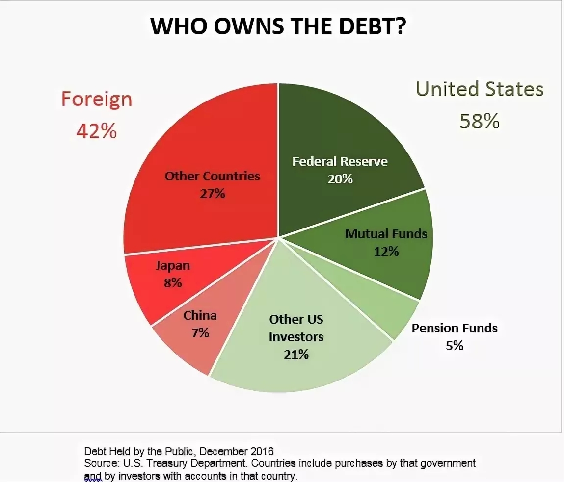 A nyní se podívejte na strukturu dluhového portfolia USA, což je úplně jiný případ. Jak vidíte, tak dluh patří cizím zemím. A zajímavé jsou ty Kajmanské ostrovy, že ano. Pár tisíc domorodců v člunech vlastní přes dvě stě miliard US-dluhu.