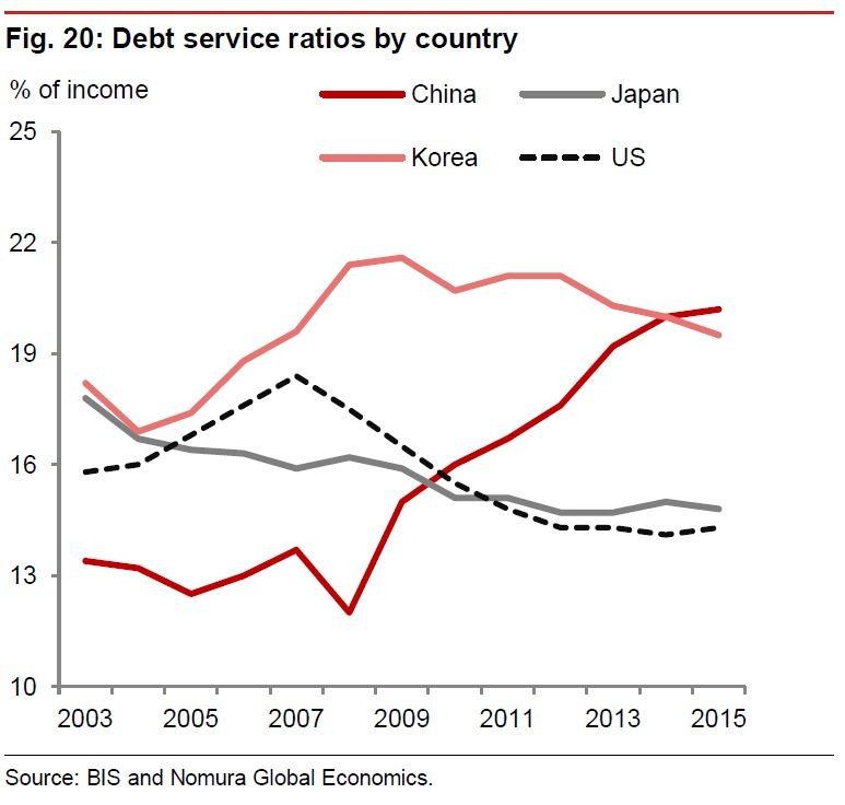 Takže Novákovi žijí efektivně na dluh, ale my jim prodáváme to mléko za dolary a také si jej v supermarketu kupujeme za dolary. Takže klíčový ukazatel není ekonomika USA, ale finanční toky dolaru. K tomu dále. Dokud USA a přilehlé daňové ráje budou sloužit jako pračka na peníze pro jedno procento z celého světa, tak je úplně jedno, jak USA hospodaří. Dluh sám o sobě v ekonomice není hlavní problém, viz přehled asijských zemí, které jsou mnohem více zadlužené než USA. Graf ukazuje obsluhu státního dluhu z procent státního příjmu.