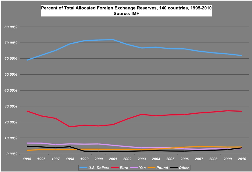 Problém ale není síla petrodolaru, jak je uvedeno na obrázku. Petrodolar nestojí nic, jen tisk nul na klávesnici a hodnotu nemá žádnou, je to poukázka na dluh. Ale reinvestice petrodolaru do USA se snižuje. Tím se logicky snižuje potřeba emitace dluhových dolarů s nulovou reálnou (ale nikoliv nominální) hodnotou. Úroky z dluhopisů jsou v podstatě nulové, protože je sežere inflace dolaru. Takže po deseti letech splácení 10letých US-obligací je dolar zase na nule a vy jste v pohodě. Graf ukazuje světové zásoby rezerv v měnách. Ale dolar šel od posledního roku na grafu (2010) ze světového obchodování určitě dolů. Nahrazuje ho zlato a obchodování v národních měnách.