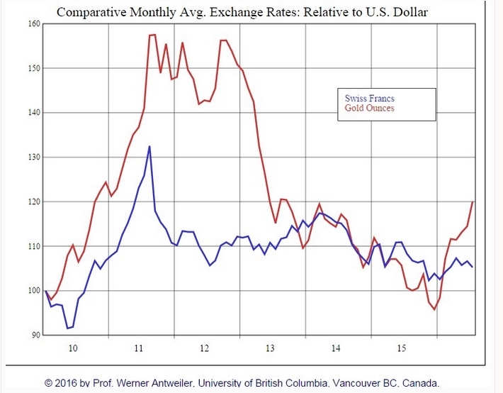 Takže hodnota franku vázaná na cenu zlata je asi 20 let zhruba stejná, i když kurz zlata měl značné výkyvy. Tomu se říká ekonomie pro 99 procent lidí a proto je ve Švýcarsku pro nás stále více draho. Ale hodnotu měny neurčuje jen zlato, to je jasné. České zlaté rezervy jsou po Tošovské akci, kterou bychom mohli nazvat „velká banksterská loupež“, třetí nejmenší ve světě. Jen tři země na světě měly v roce 2015 k poměru k devizovým rezervám méně zlata než Česko a to bylo zhruba 0,8 % devizových rezerv ve zlatě. Slovensko mělo v roce 2015 poměr 31,7 % a Německo 67,8 %, ale musí si urychleně stáhnout z USA zlato domů.