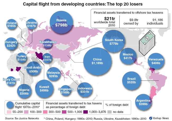 Z grafu vidíte, že jde o ohromný typ nepotrestaných zlodějen, které ničí sociální strukturu národních států a jejich ekonomiku. Nyní je jasné, proč už v roce 2013 Tiskaři nekrytých peněz vytvořili celosvětový kartel. Kompostace dluhových dolarů v daňových rájích měla po pádu východního bloku téměř zázračnou konjunkturu a tamější pátá kolona neoliberálů ničila celé státy. Proto se málem nestačily tisknout dluhové dolary, taková po nich byla poptávka. Za ten papírek se rozkradlo všechno, viz F. R. Čech. A nyní se podívejte na seznam zemí s největšími daňovými úniky v roce 2012. Rusko ve zlodějnách kralovalo, přitom byla tato země na pokraji rozvratu a na prahu občanské války.